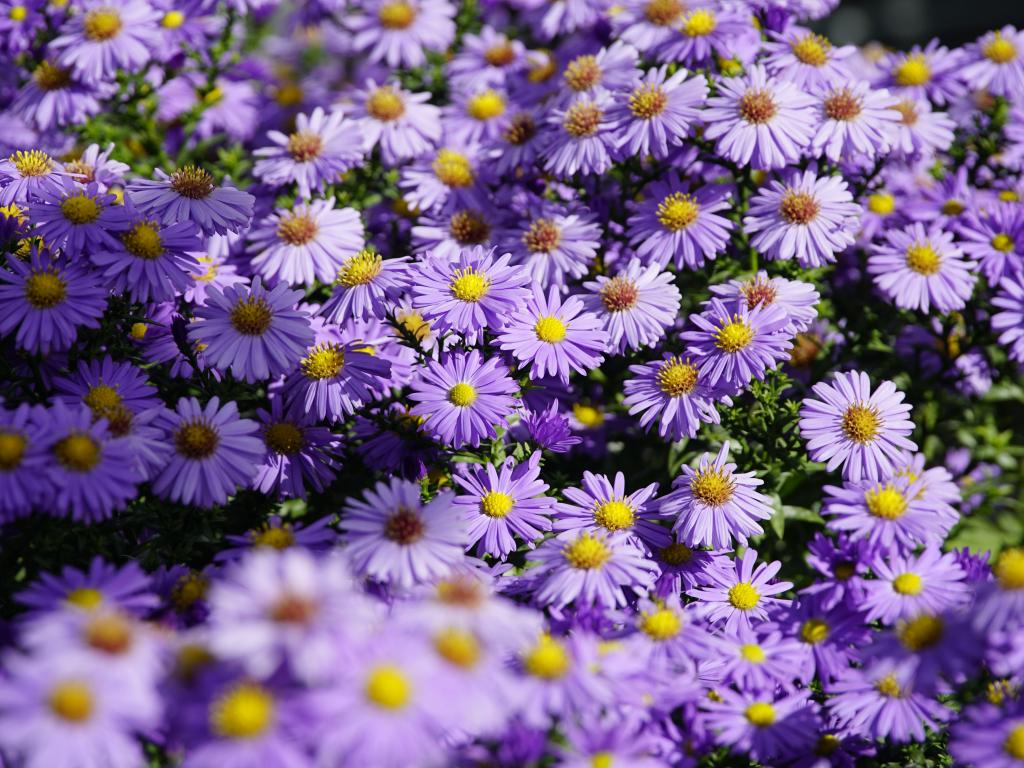 Обои Много сиреневых цветов сентябринки в лучах солнца