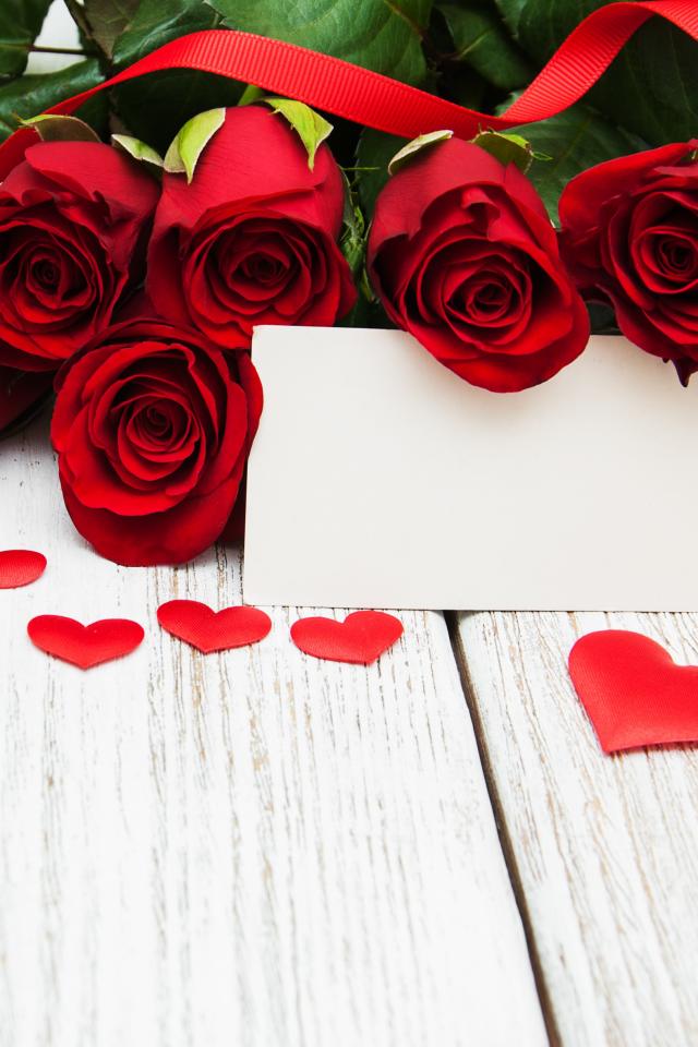 Обои Букет красных роз на столе с сердечками и открыткой