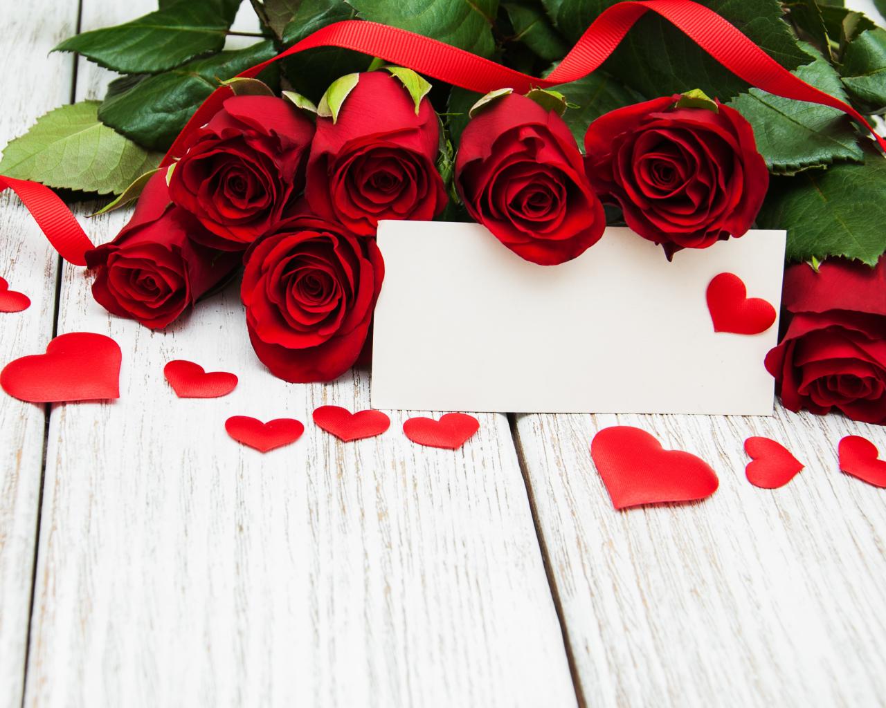 Обои Букет красных роз на столе с сердечками и открыткой