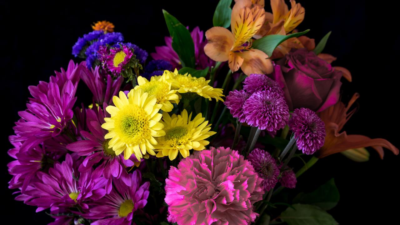 Обои Букет разноцветных цветов на черном фоне крупным планом