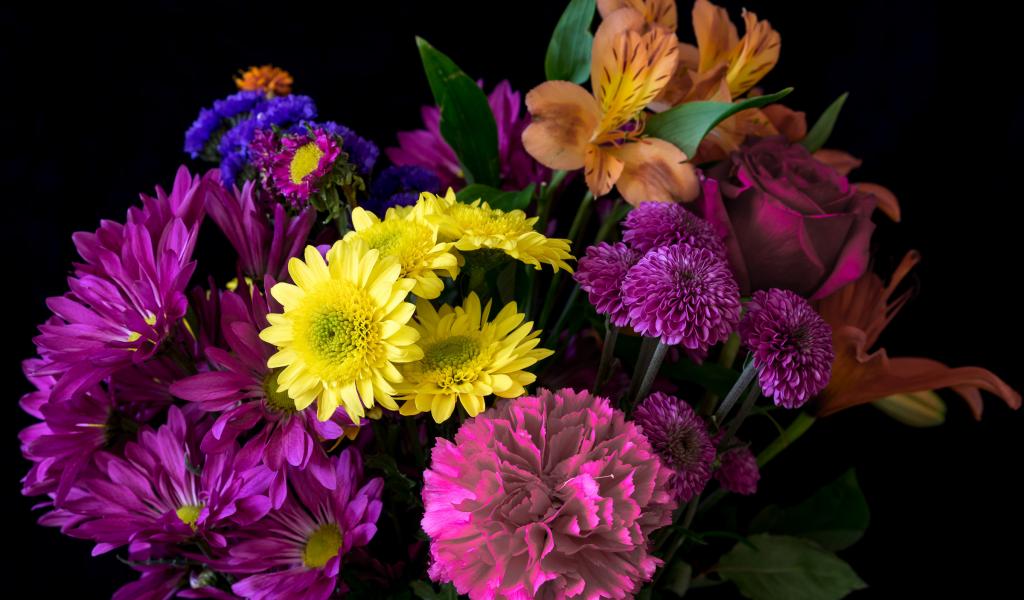 Обои Букет разноцветных цветов на черном фоне крупным планом