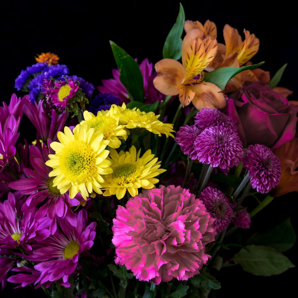 Обои Букет разноцветных цветов на черном фоне крупным планом