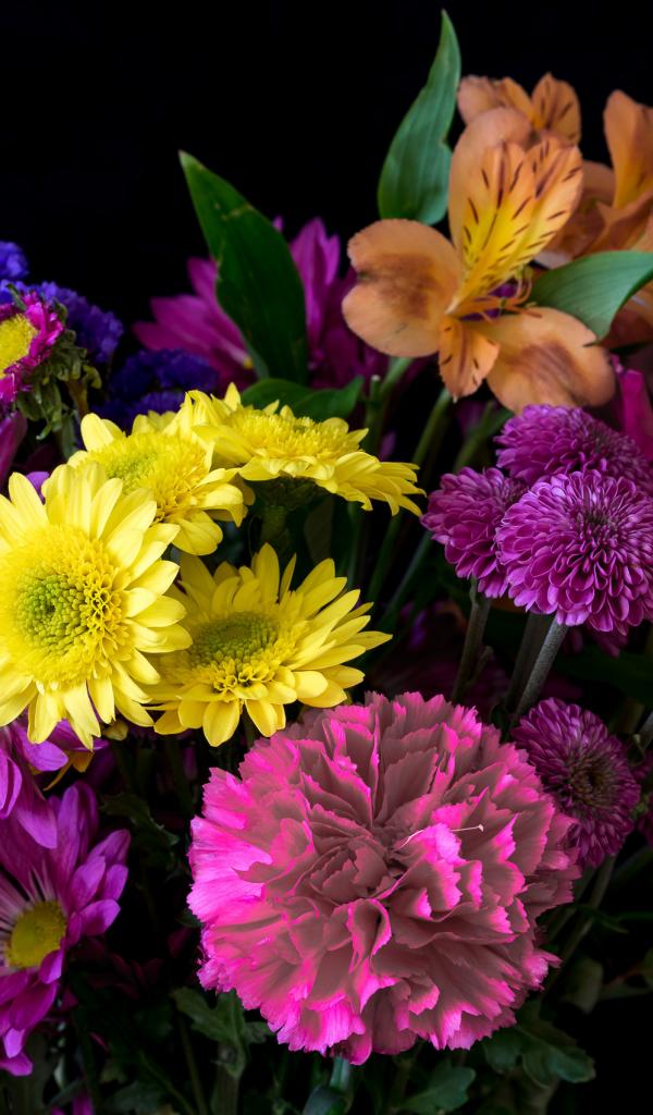 Обои Букет разноцветных цветов на черном фоне крупным планом