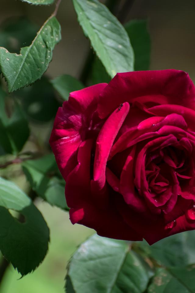 Обои Красная садовая роза с зелеными листьями крупным планом