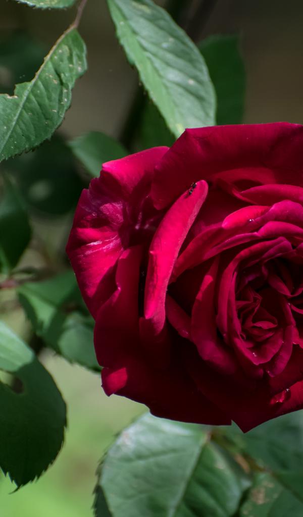 Обои Красная садовая роза с зелеными листьями крупным планом