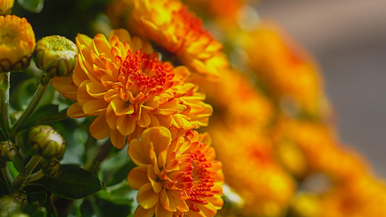 Обои Красивые оранжевые осенние хризантемы в лучах солнца