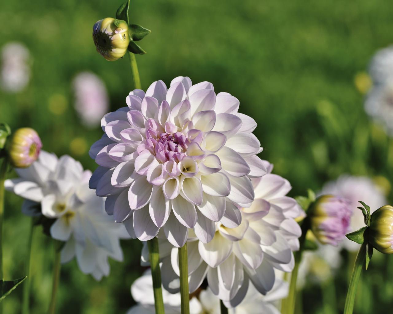 Обои Нежные сиреневые цветы георгины с бутонами на клумбе