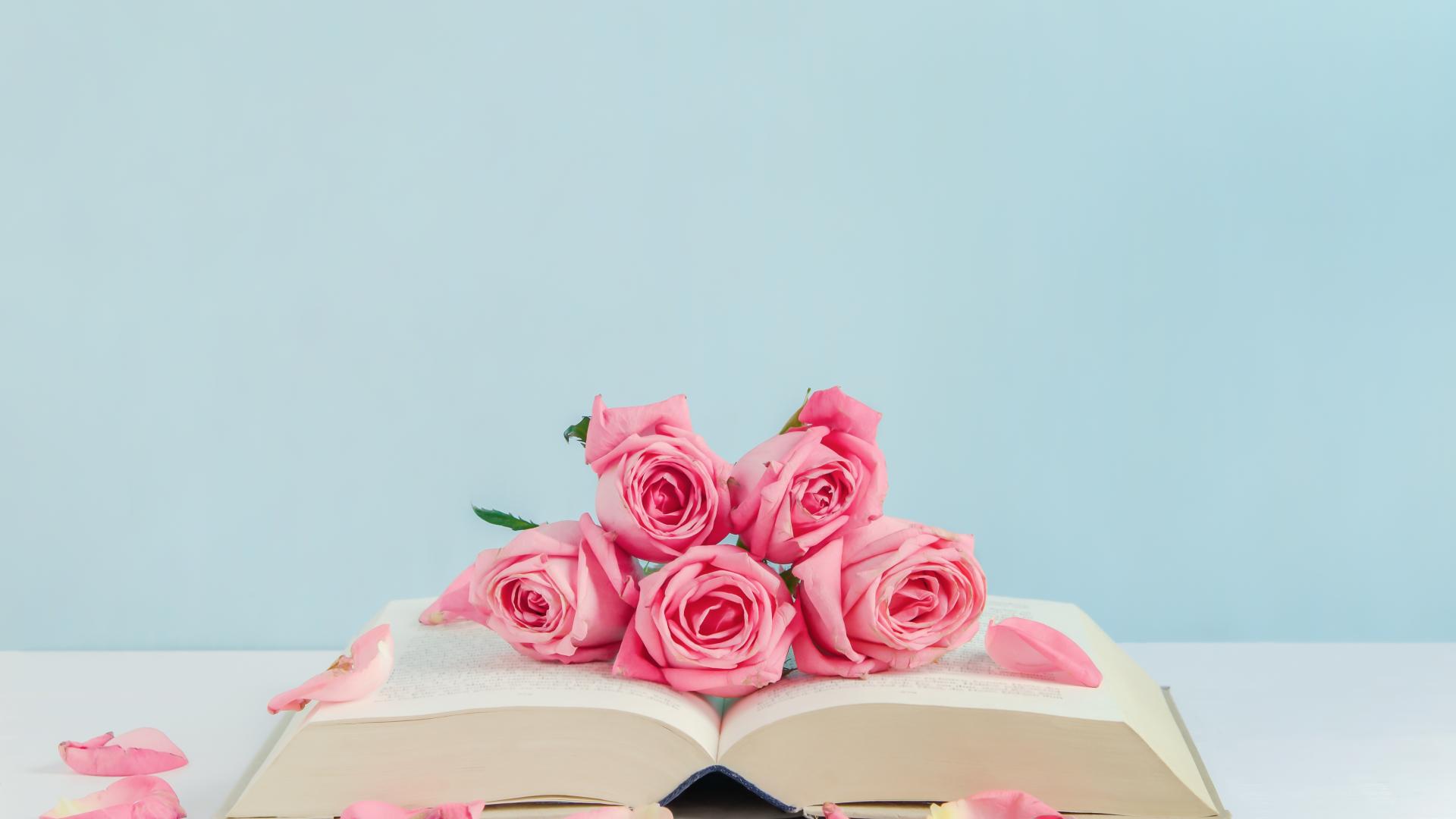 Обои Розовые цветы розы с книгой на голубом фоне