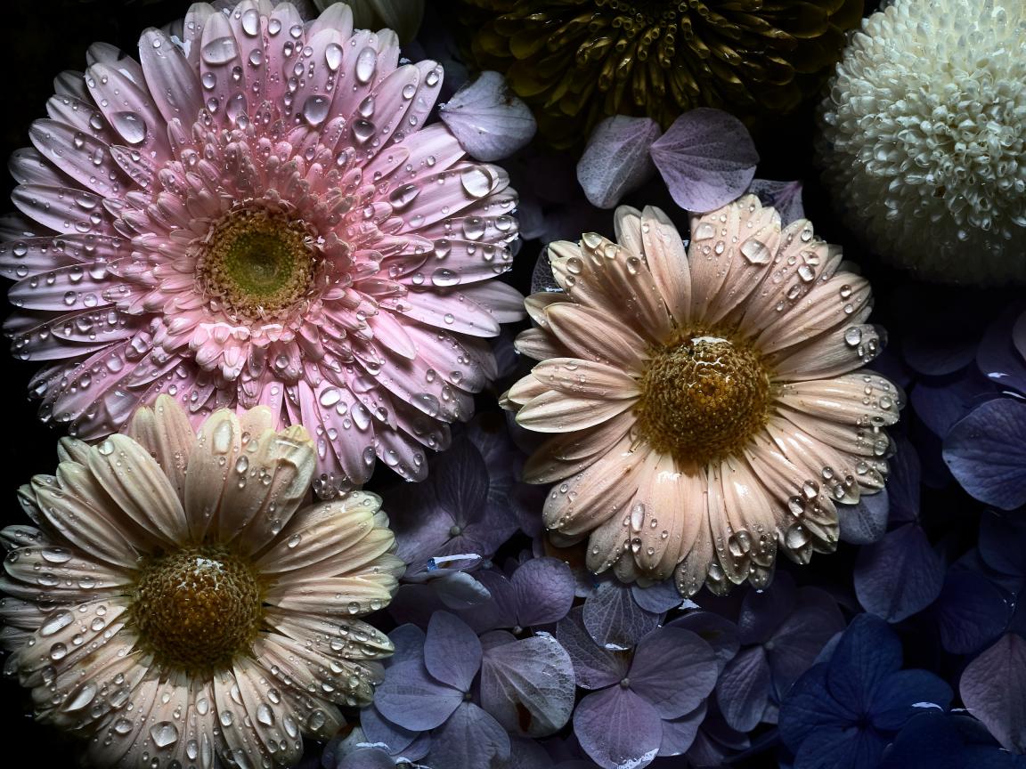 Обои Цветы герберы и гортензии в каплях воды