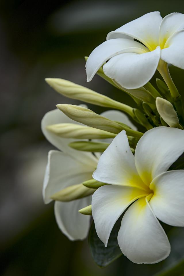 Обои Белые цветы плюмерии с бутонами на ветке