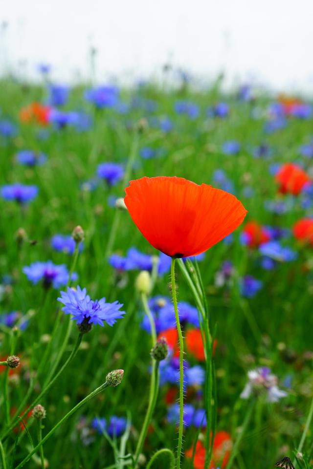 Обои Красные маки и голубые васильки в поле