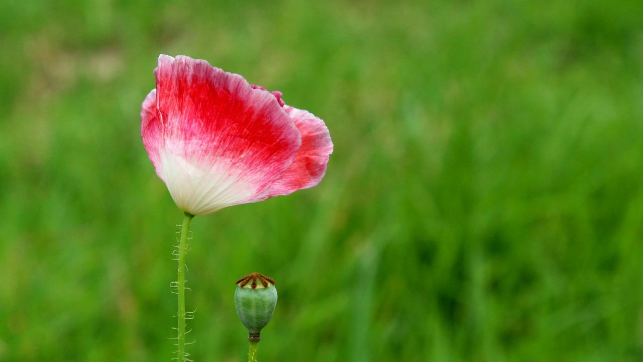 Обои Розовый цветок мака с бутоном на зеленом фоне
