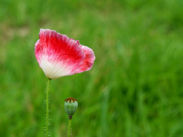 Обои Розовый цветок мака с бутоном на зеленом фоне