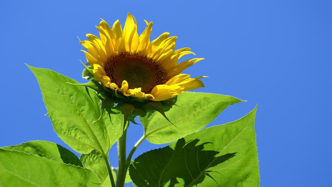 Обои Желтый цветок подсолнуха в лучах солнца на фоне голубого неба