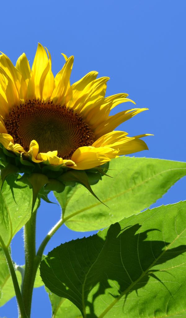 Обои Желтый цветок подсолнуха в лучах солнца на фоне голубого неба