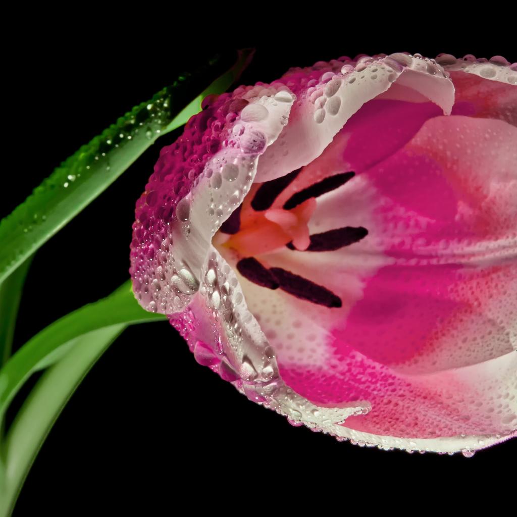 Обои Розовый цветок тюльпана в каплях росы на черном фоне