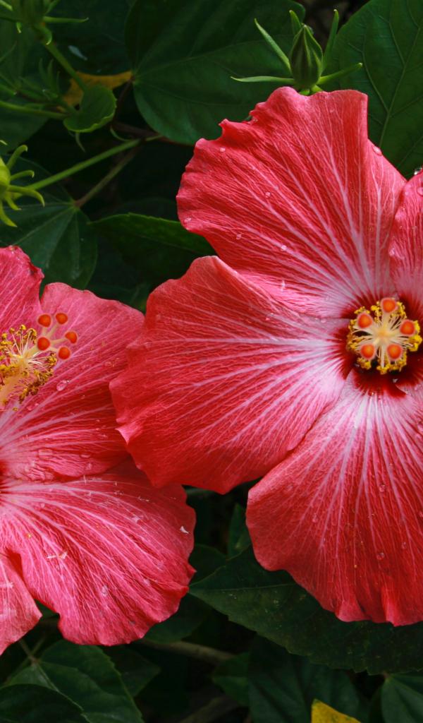 Обои Два больших красных цветка гибискуса в зеленых листьях