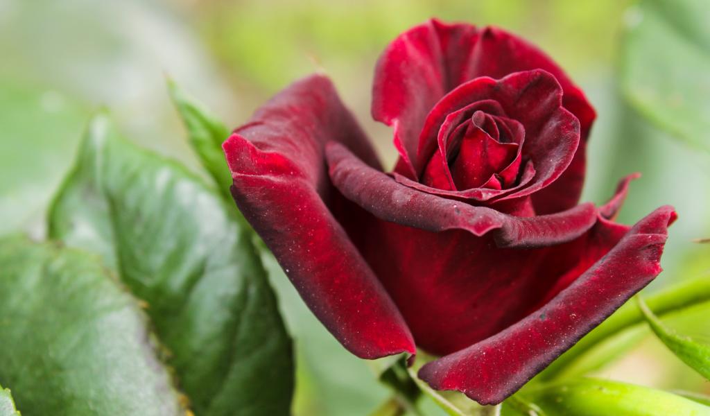 Обои Красивая бордовая роза с зелеными листьями крупным планом