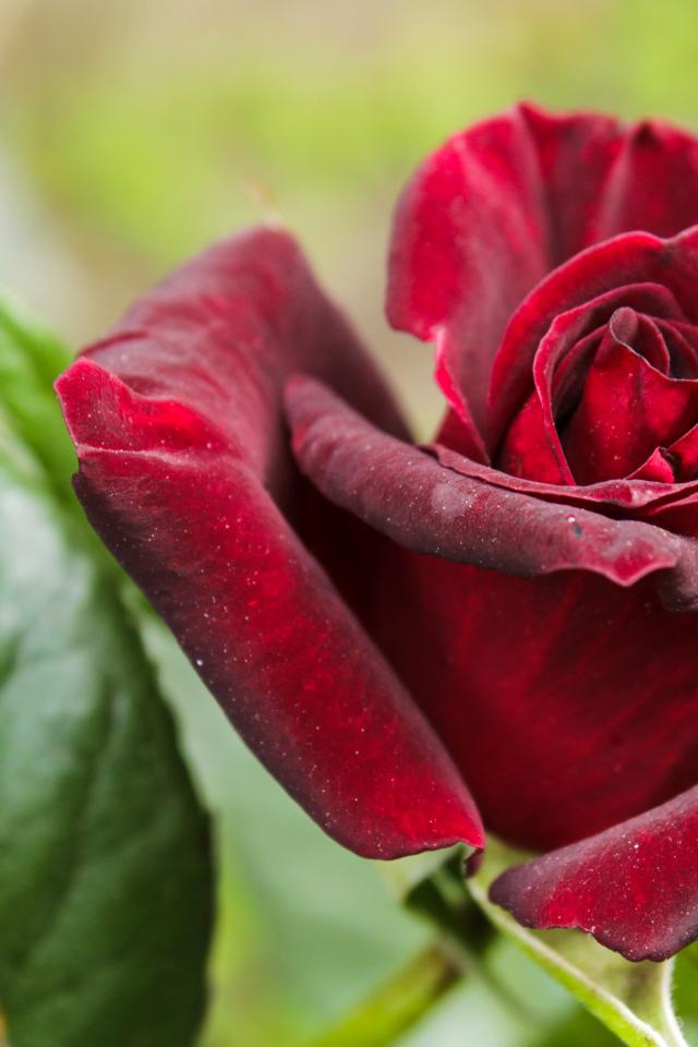 Обои Красивая бордовая роза с зелеными листьями крупным планом