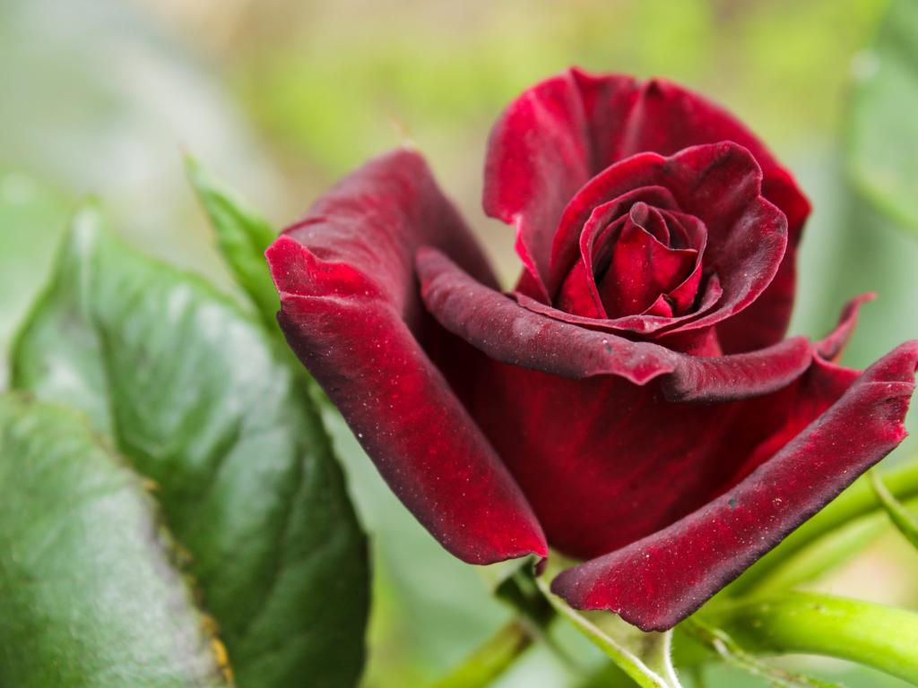 Обои Красивая бордовая роза с зелеными листьями крупным планом