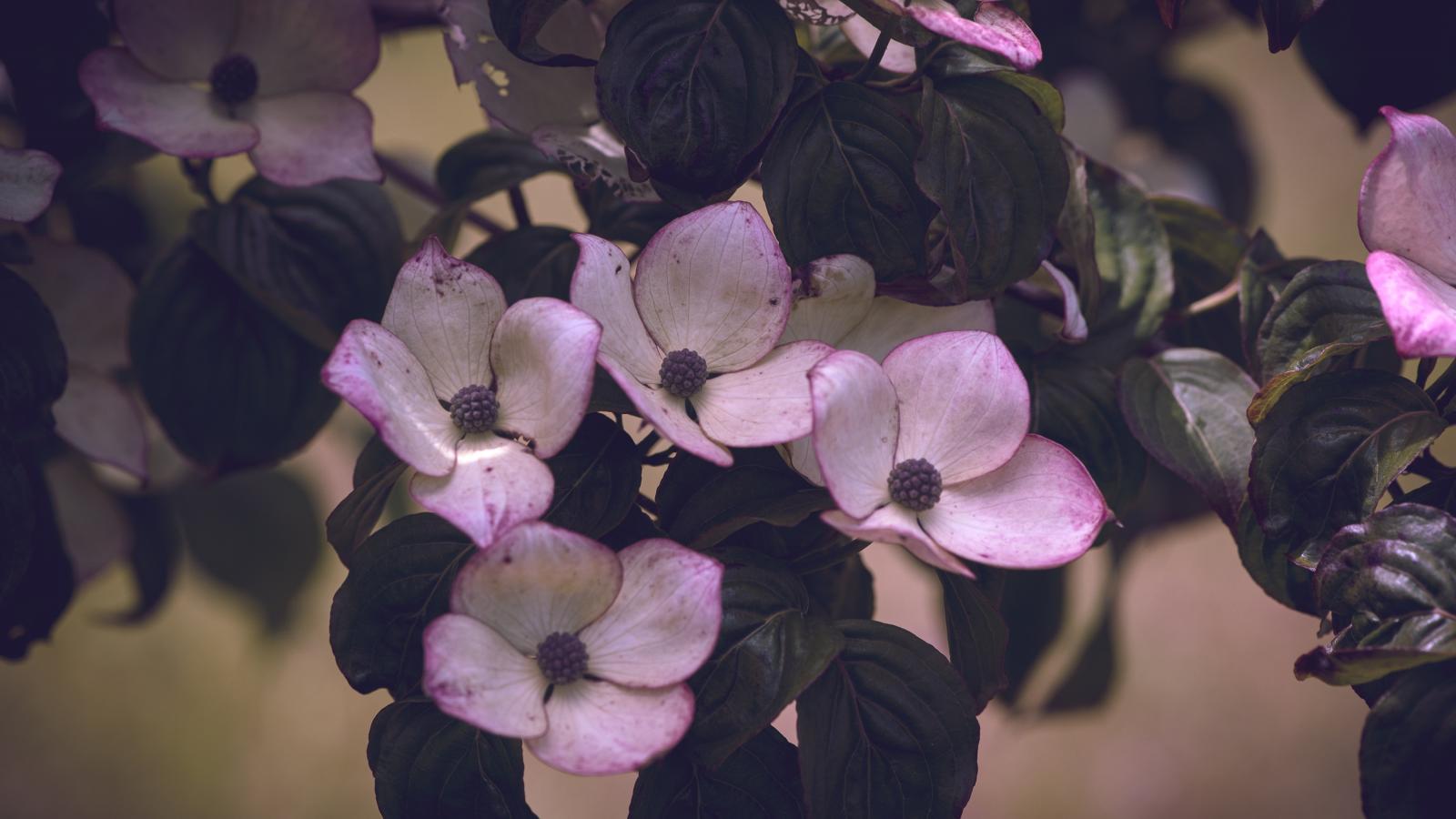 Обои Розовые цветы с зелеными листьями на дереве