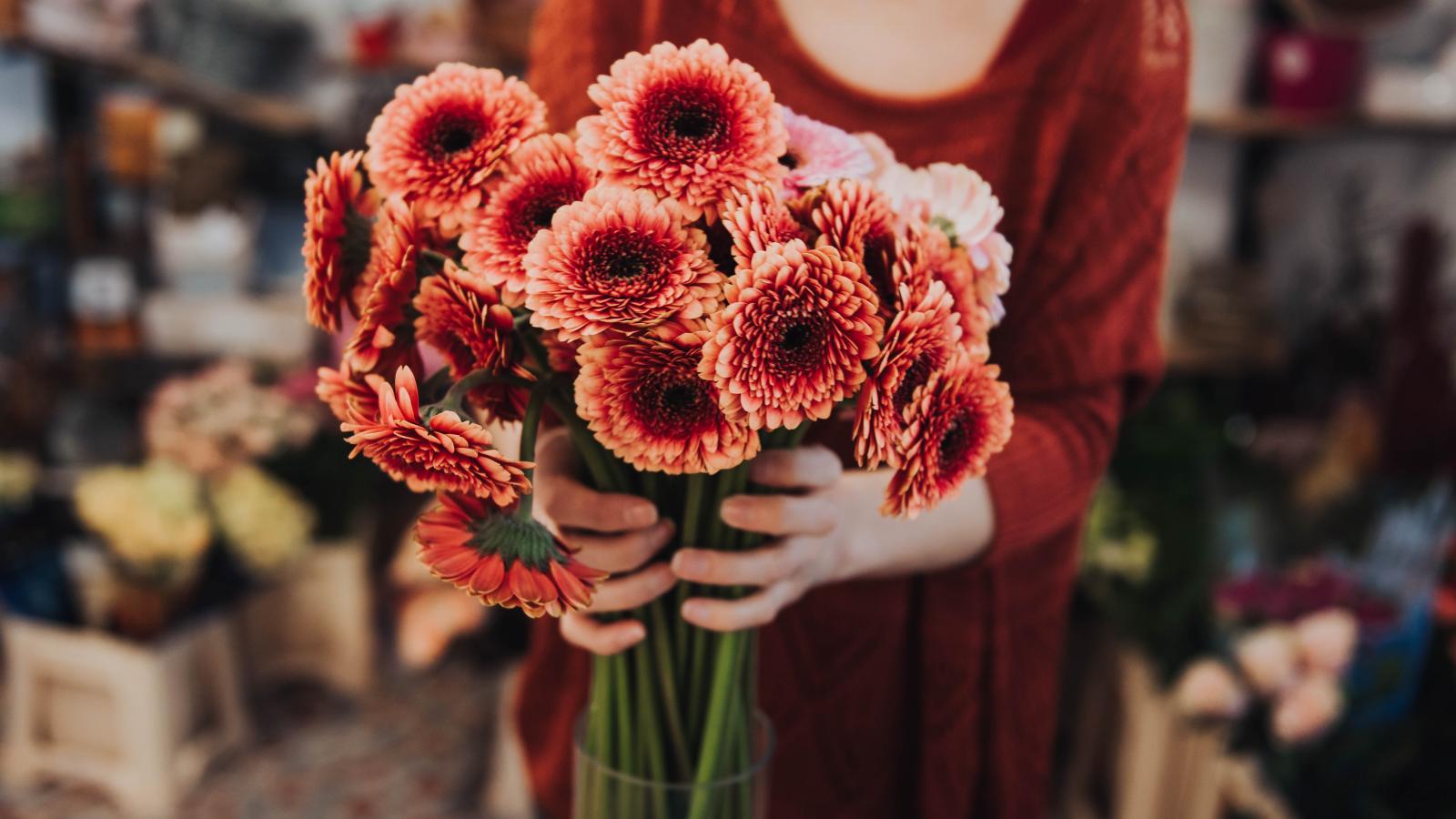 Обои Красивый букет оранжевых гербер в руках у женщины