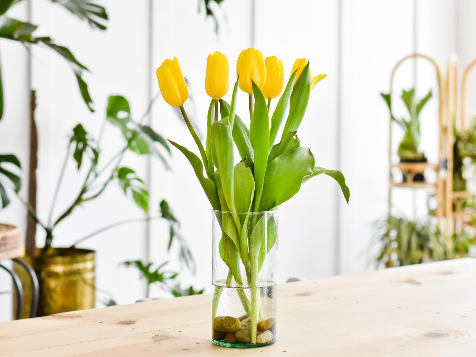 Обои Букет желтых тюльпанов в стеклянной вазе на столе
