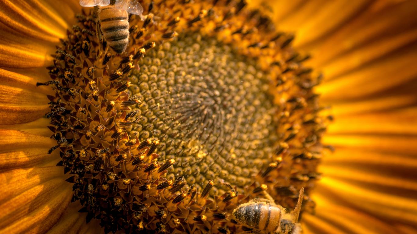 Обои Пчелы собирают нектар с цветка подсолнуха
