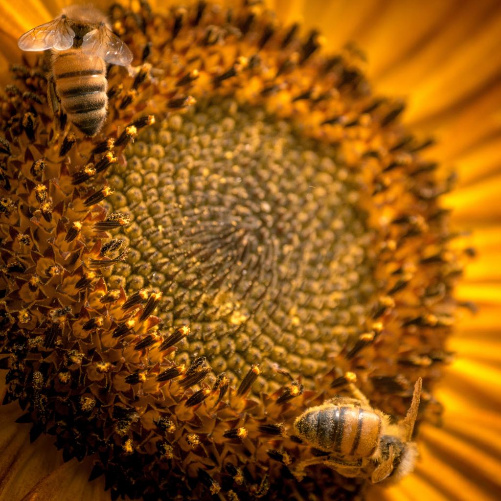 Обои Пчелы собирают нектар с цветка подсолнуха