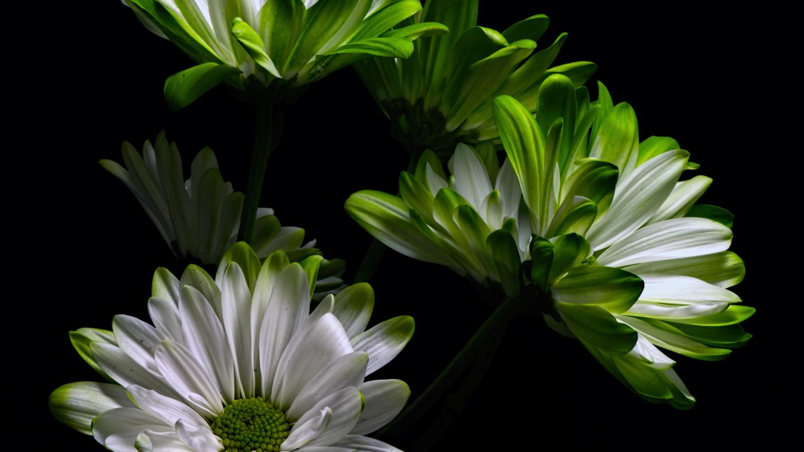 » Обои Бело-зеленые цветы хризантемы на черном фоне