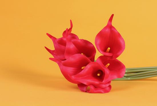Обои Красные цветы каллы на желтом фоне