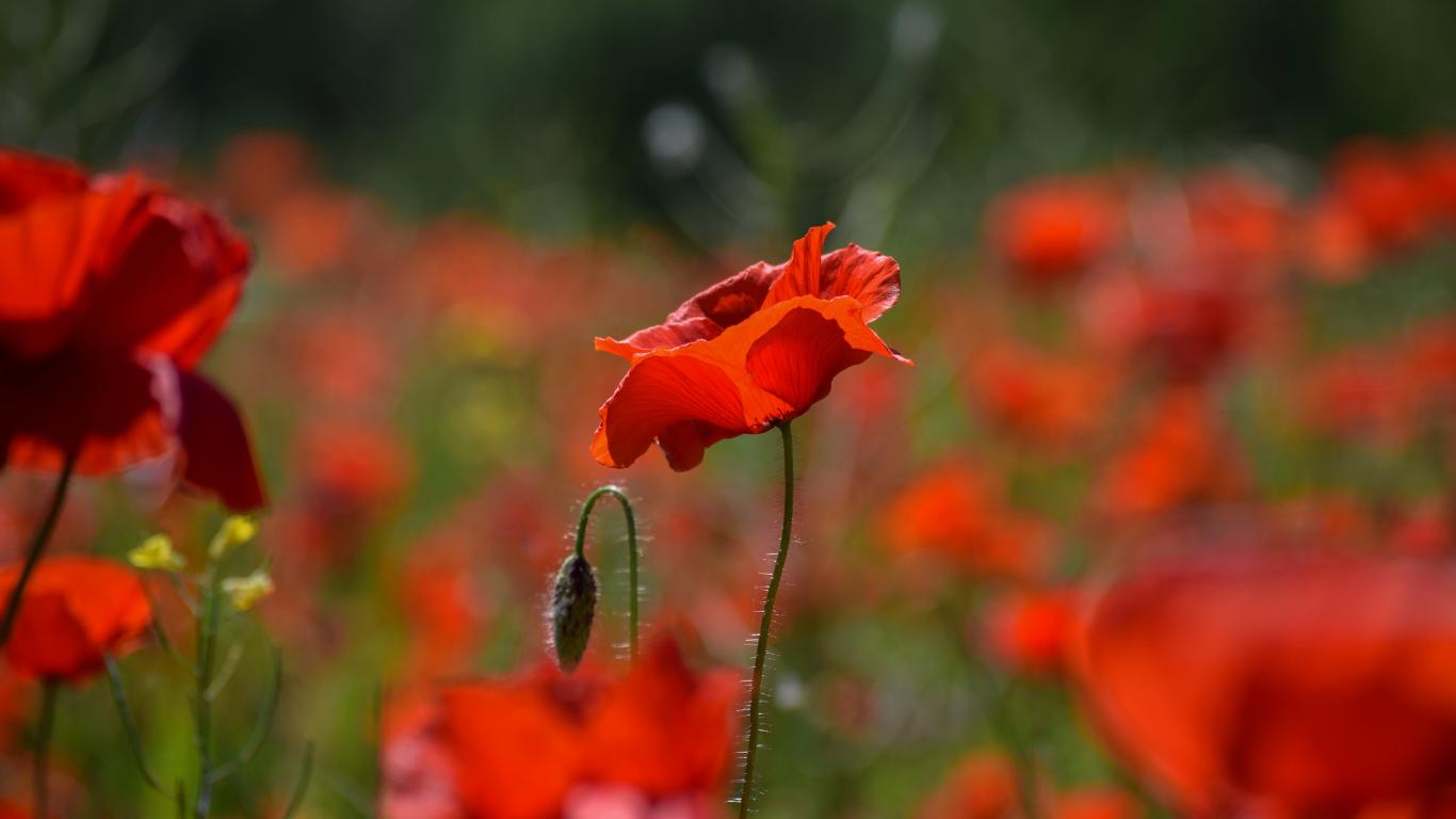 Обои Много красных цветов мака с бутонами на поле