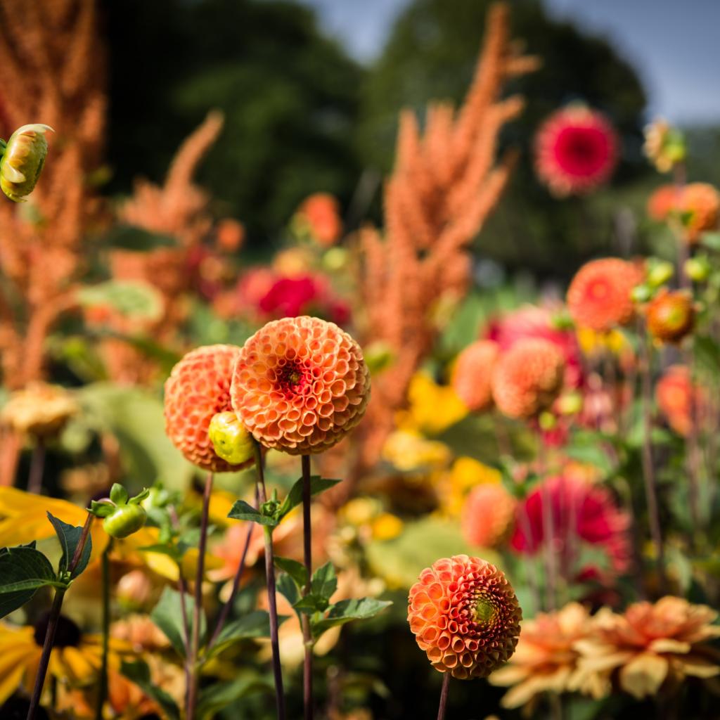 Обои Красивые оранжевые цветы георгины на клумбе