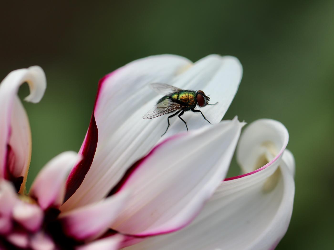 Обои Зеленая муха на лепестке георгина