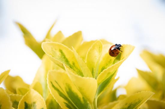 Обои Красная божья коровка на зеленых листьях