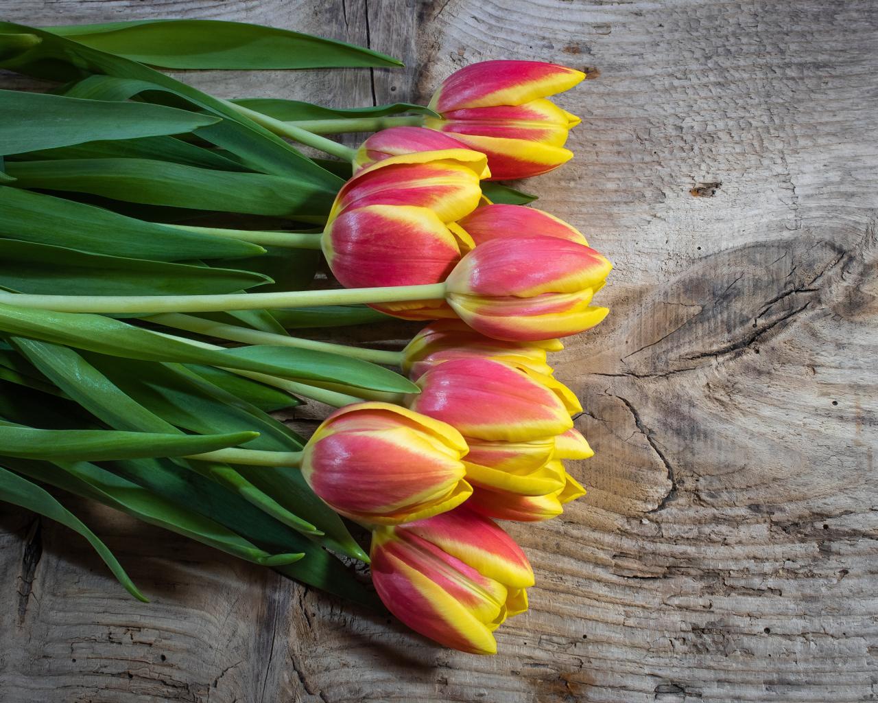 Обои Букет красных тюльпанов с желтыми ободками на деревянном столе