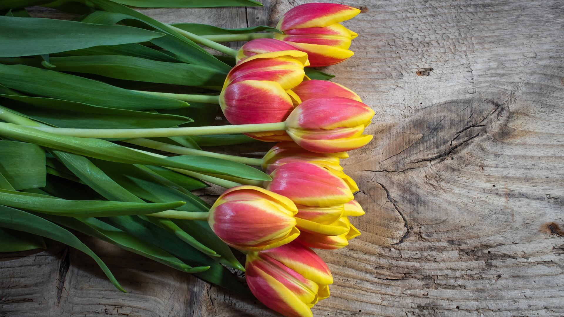 Обои Букет красных тюльпанов с желтыми ободками на деревянном столе