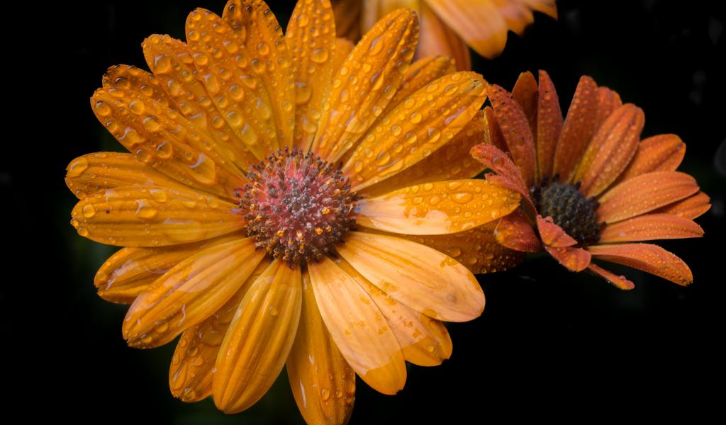 Обои Оранжевые цветы в каплях росы на черном фоне