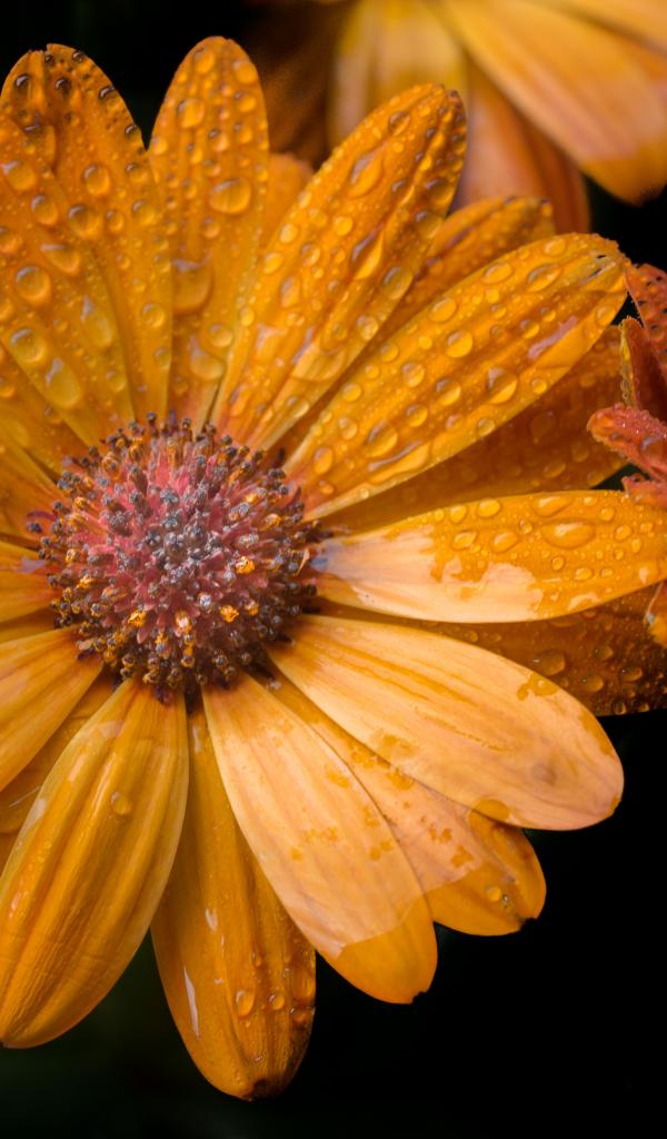 Обои Оранжевые цветы в каплях росы на черном фоне