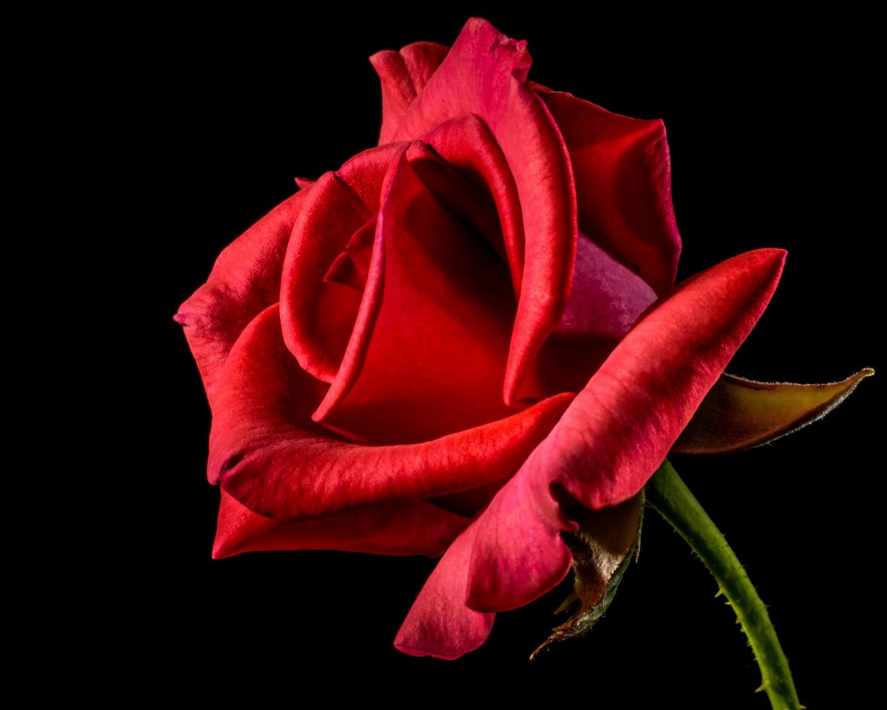 Обои Красная роза с лепестками лежит на мокрых черных камнях