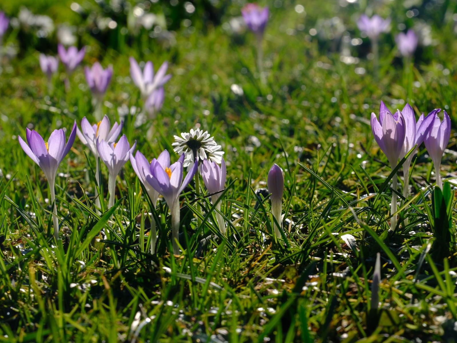 Обои Маленькие сиреневые цветы крокуса на зеленой траве