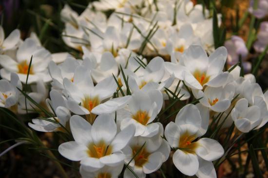 Обои Белые маленькие цветы крокусы с зелеными листьями