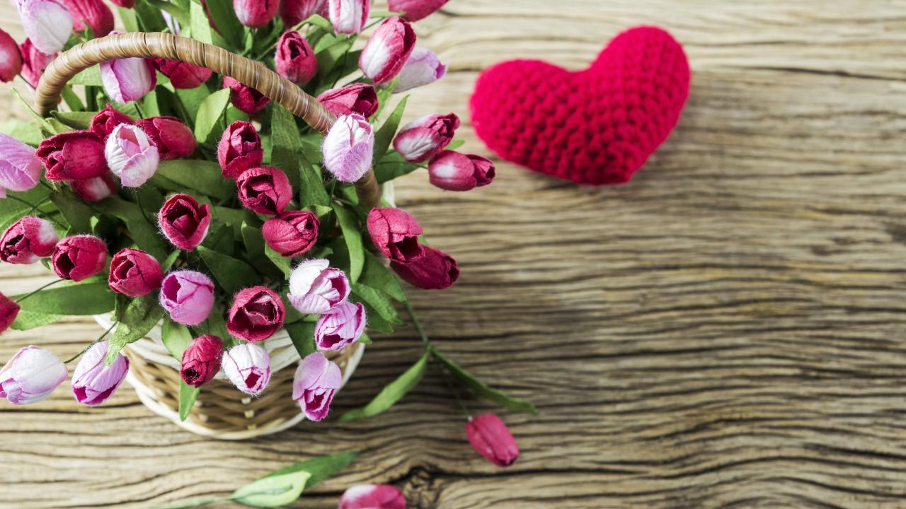 Обои Корзина тюльпанов из ткани на столе с сердцем