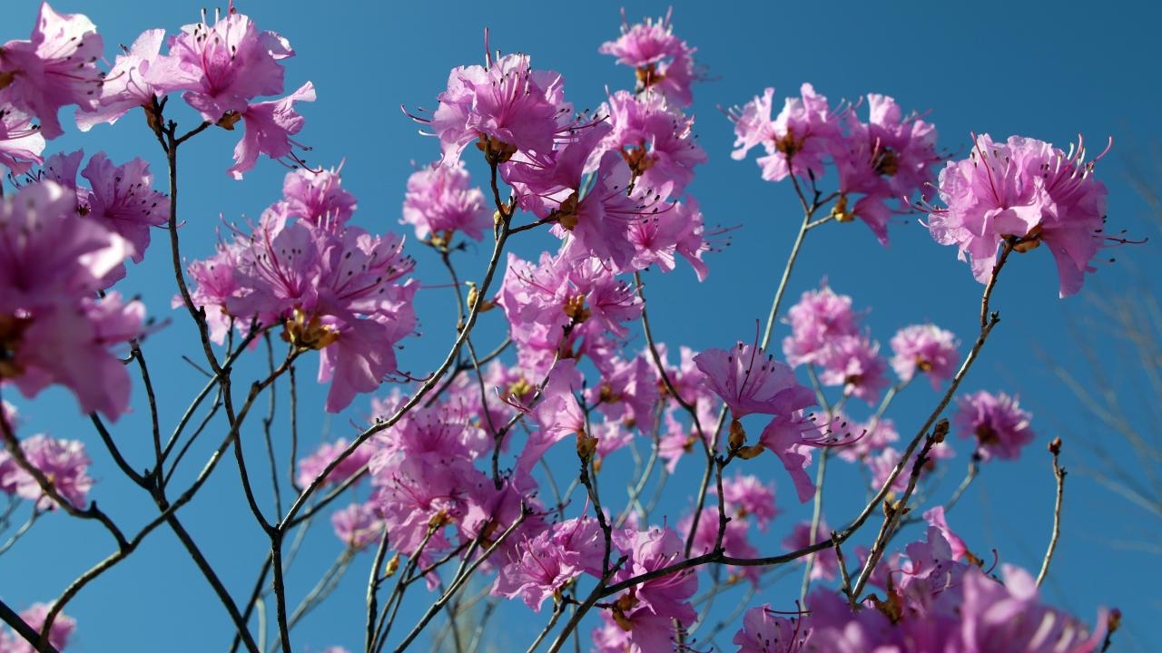 Обои Розовые цветы азалия на ветках дерева на фоне голубого неба