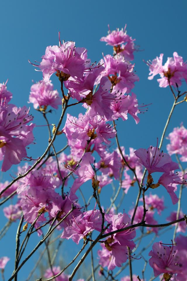 Обои Розовые цветы азалия на ветках дерева на фоне голубого неба