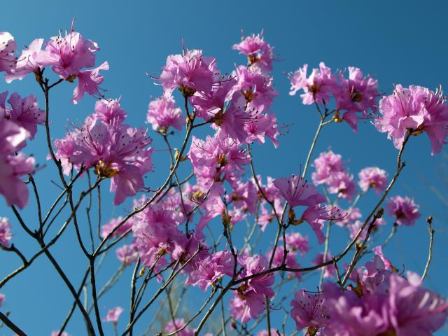 Обои Розовые цветы азалия на ветках дерева на фоне голубого неба