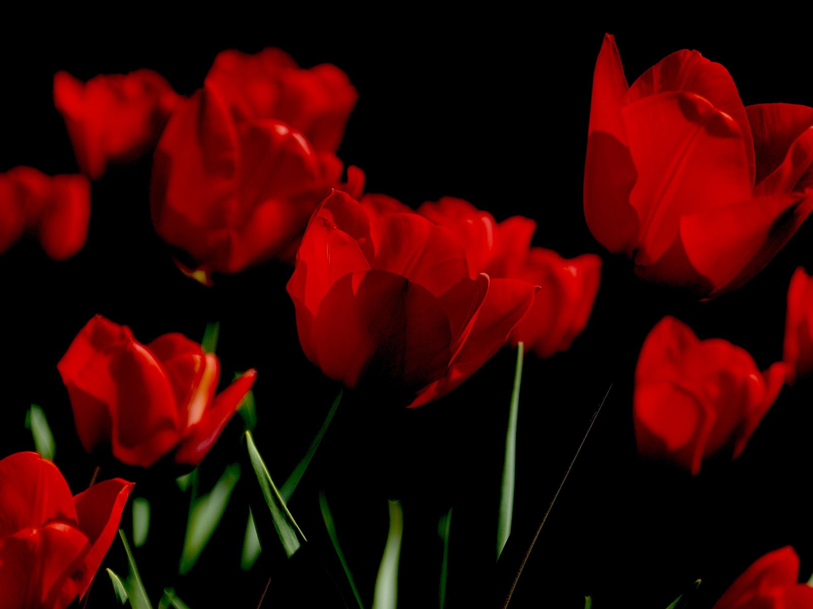 Обои Яркие алые весенние тюльпаны на черном фоне
