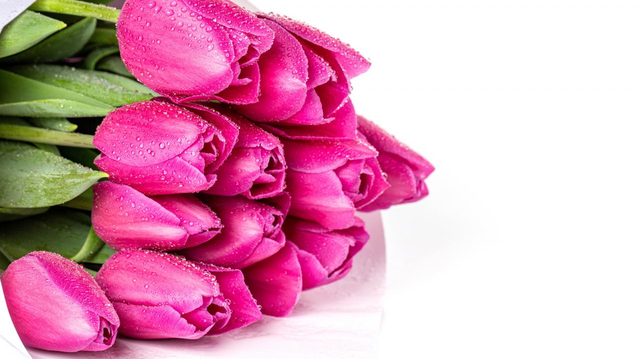 Обои Букет розовых тюльпанов в каплях росы на белом фоне