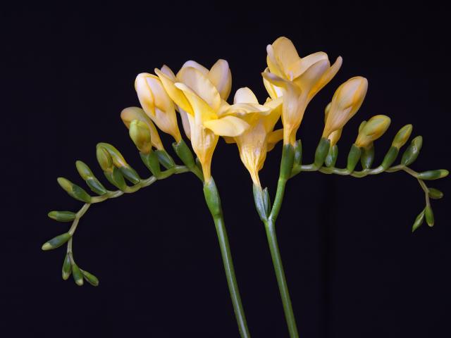 Обои Красивый желтый цветок фрезии с бутонами на черном фоне