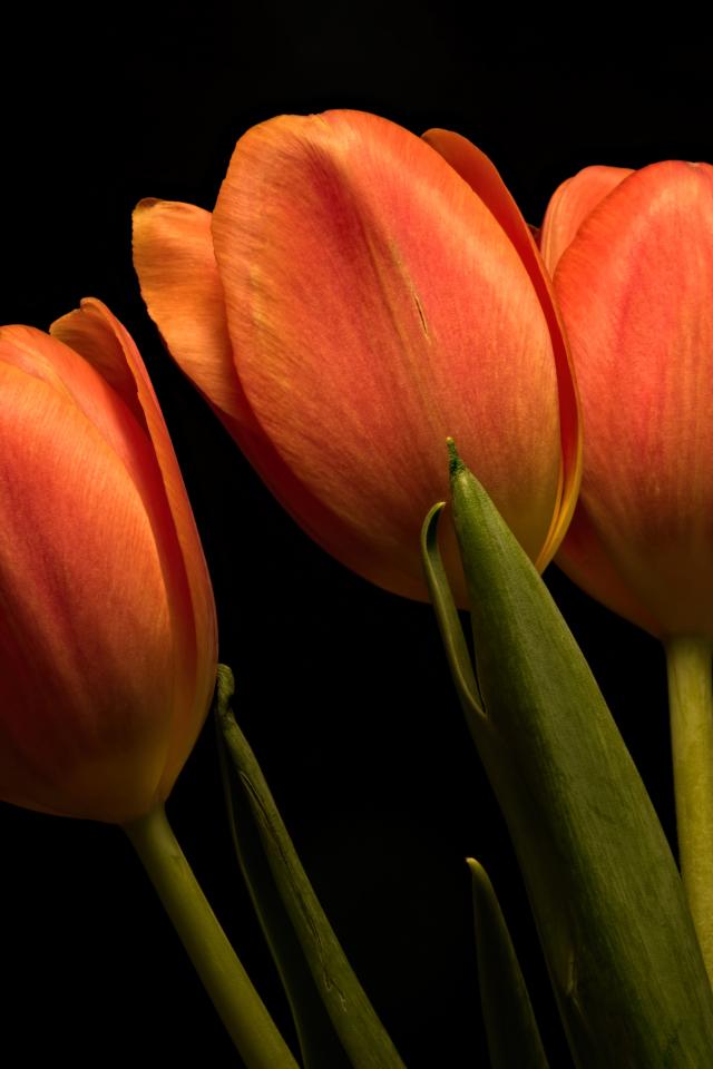 Обои Три оранжевых тюльпана с зелеными листьями на черном фоне